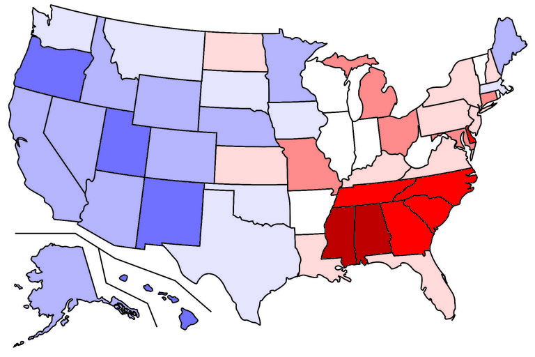 I tinkered with different details for visualization, but it was always based on taking a US map and coloring each state according to the frequency of the name in that state. I'd been using the free GIMP editor for years without taking advantage of its "Python-Fu" feature, and this seemed like the perfect reason to learn how. This allowed me to automate the visualization process as well.